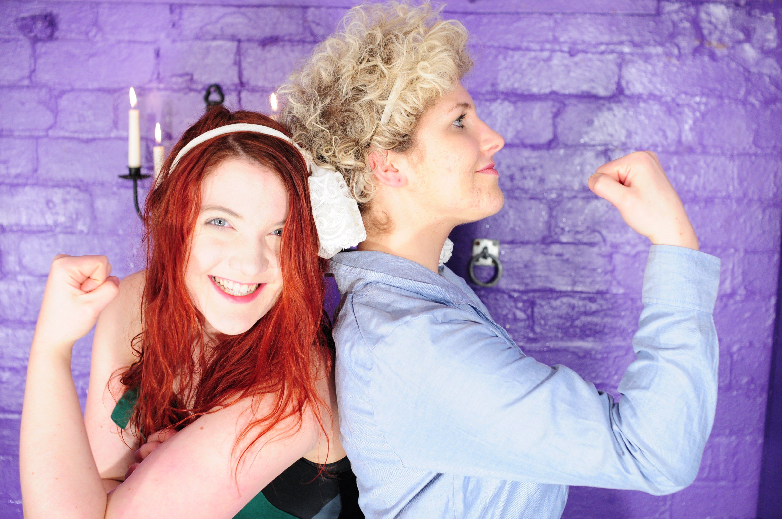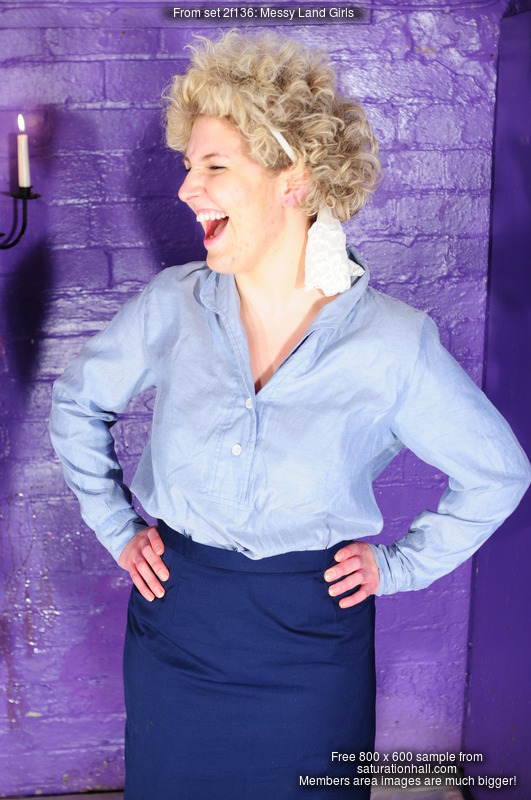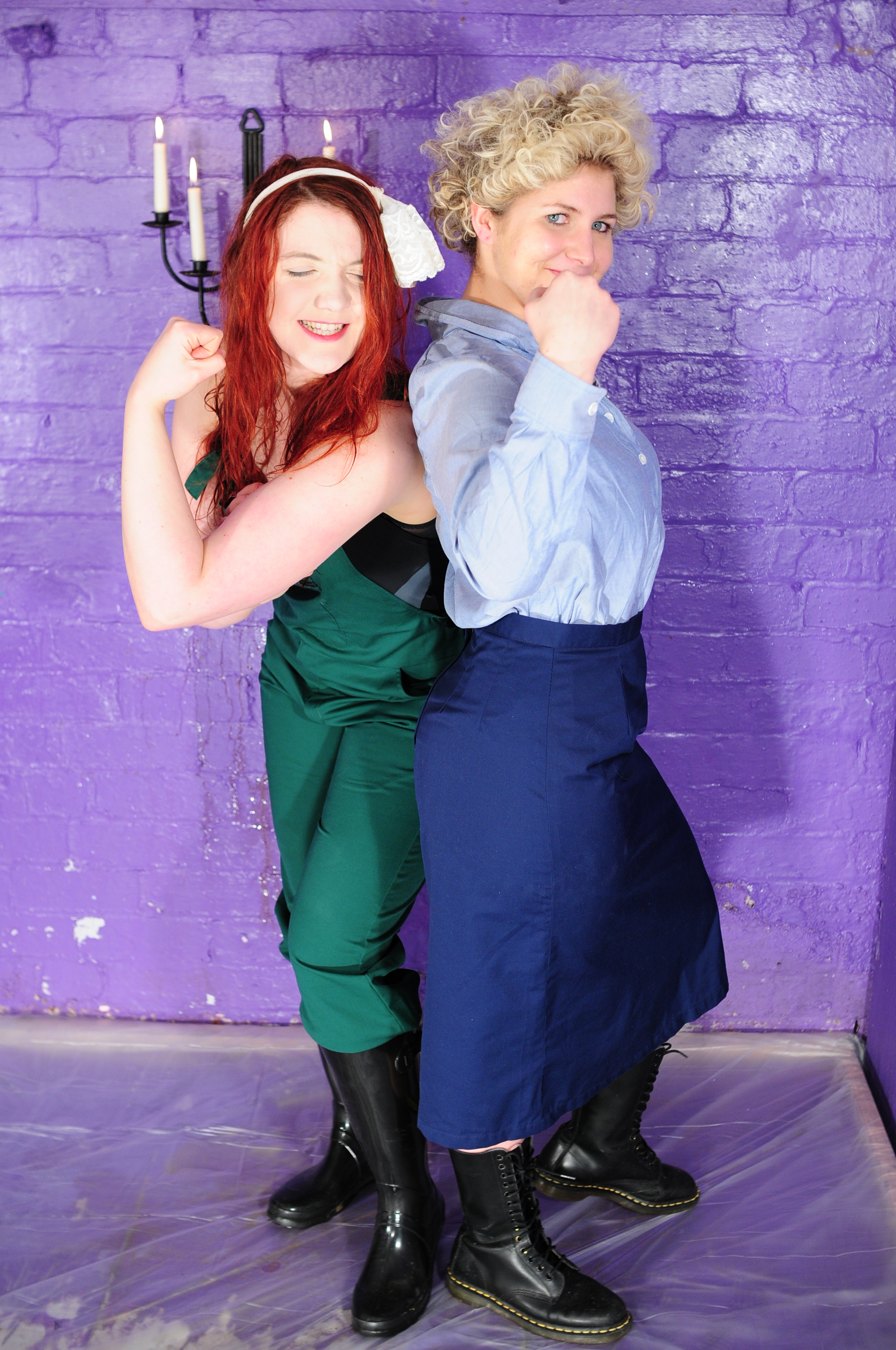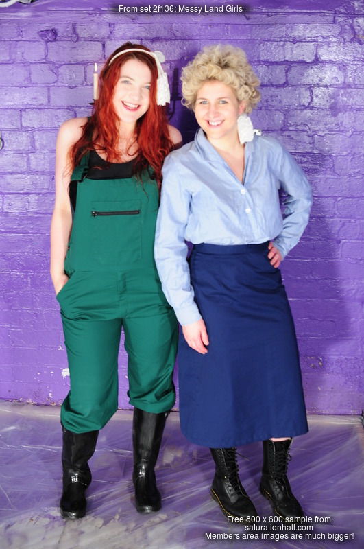 Best friends Scarlet and Morgana are dressed for work, Scarlet in smart dark blue knee length skirt, pale blue blouse, and sturdy work boots, while Morgana wears green dungarees tucked into black wellies, with a swimsuit under her overalls, and they both have matching tied stockings as hair decoration. And they're going to make a total mess of each other!