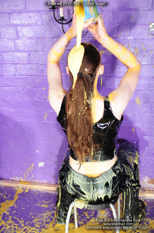 Dressed in skin tight black PVC jeans, black lace-up PVC top, and huge Goth boots, Chastity has lots of custard thrown over herself from off camera, and gradually gets completely covered. Once she's had a fair few throws she pours more over and into her clothes, and eventually gives herself a total custard shampoo and facial too.