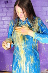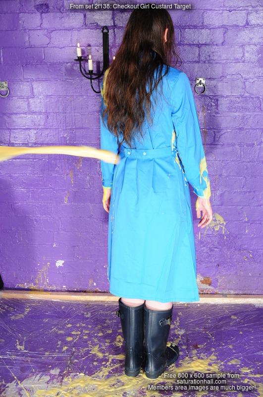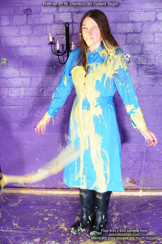 Dressed in a genuine 1990s ASDA supermarket checkout girl uniform dress, Chastity stands in the dungeon and has rather a lot of custard thrown at her from off camera. The person throwing had been told to aim for the skirt of her dress first, but managed to achieve a quite impressve face hit with the very first throw! Chastity gets totally covered in custard and then adds syrup to the mix, gives herself a very messy shampoo, and eventually sits and lies in the puddle of goo on the floor to finish herself off.