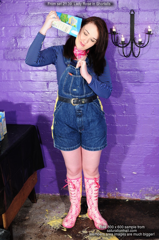 She thoroughly fills the shortalls, pouring custartd and syrup into them, both down the inside and filling her pockets, and then once she's nice and soggy, she completely covers the outside of her outfit too. Her bare legs and boots don't escape the treatment, and once she's sitting in the pool of mess on the floor she pours syrup and custard all over her hair and head too, ending up completely drenched in mess from head to foot.