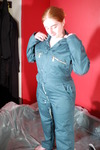 Now she unfolds her brand new, spotlessly clean green boilersuit, and pulls it on, over the custard-filled swimsuit, neatly zipping herself up and closing the press studs, before filling the breast poskets with an entire carton of custard each. Meanwhile her swimsuit continues to leak and by the time her pockets are filled, the upper legs and bum of the boilersuit are clearly suffering from the internal flow of custard. She then sits down to pull her wellingtons on, which really squeltches the custard inside, and more leaks from the filled pockets to land on her legs.