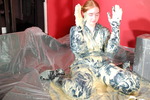 She continues, carefully and with great attention to detail, covering her entire suit in custard. As well as the custard filled wellies, she also puts on custard filled black rubber gauntlets, and all the while continuing to spread and massage custard all over her boilersuit.