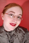 Dressed to the office nines in a high-collared grey striped satin blouse, black office skirt, stockings with suspender belt, and high heeled shoes, and finished off with her stern glasses and bright red lipstick, Sister Graves looks every inch the strict office boss.