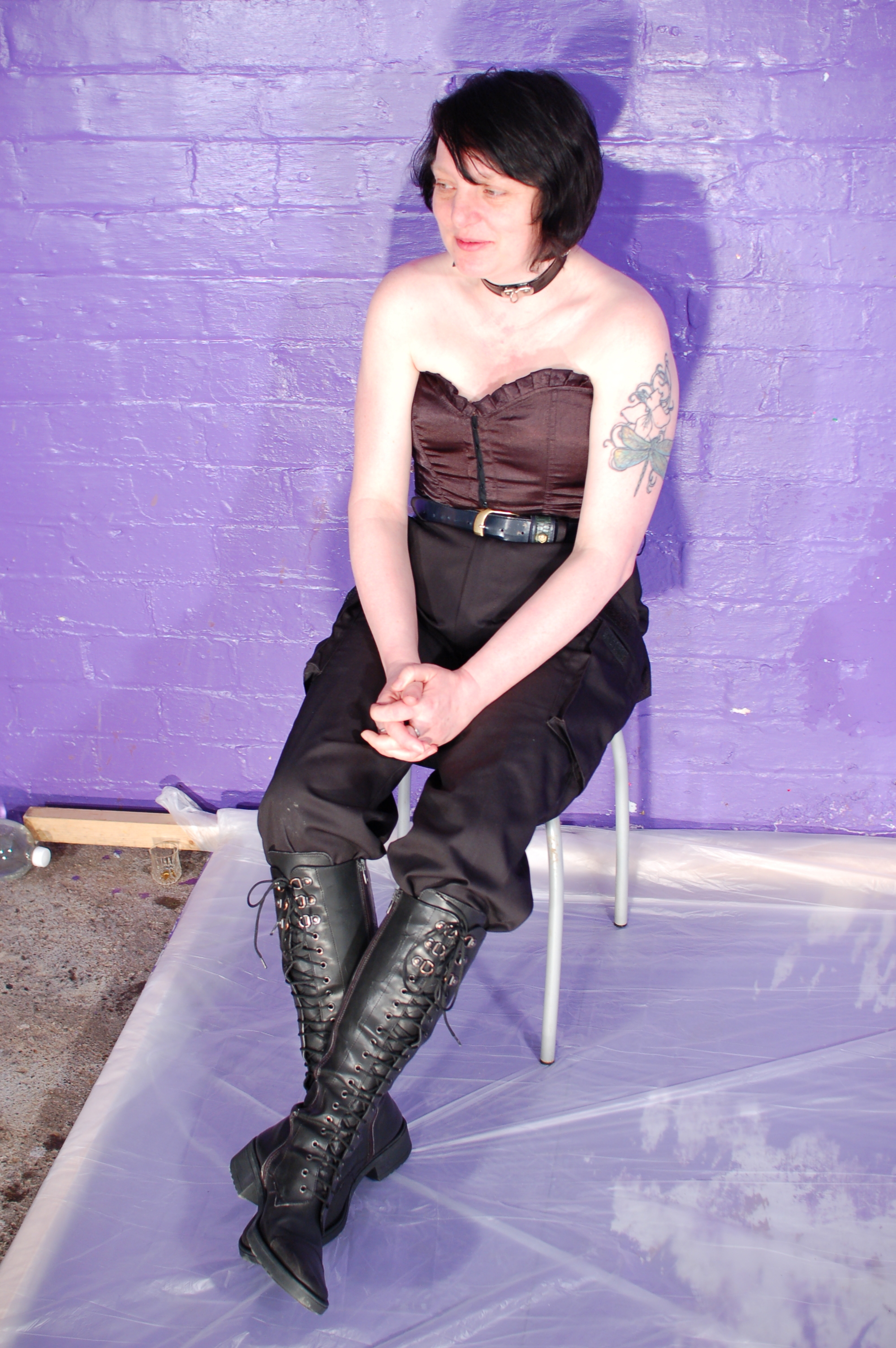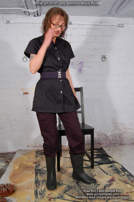 Lady Jasmine gives herself the full treatment while wearing a beutician's uniform of tunic and black combat trousers, with black wellies.