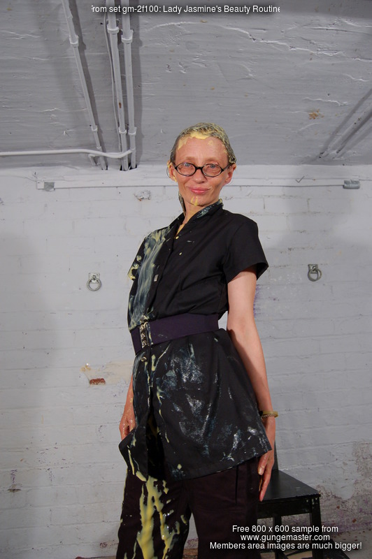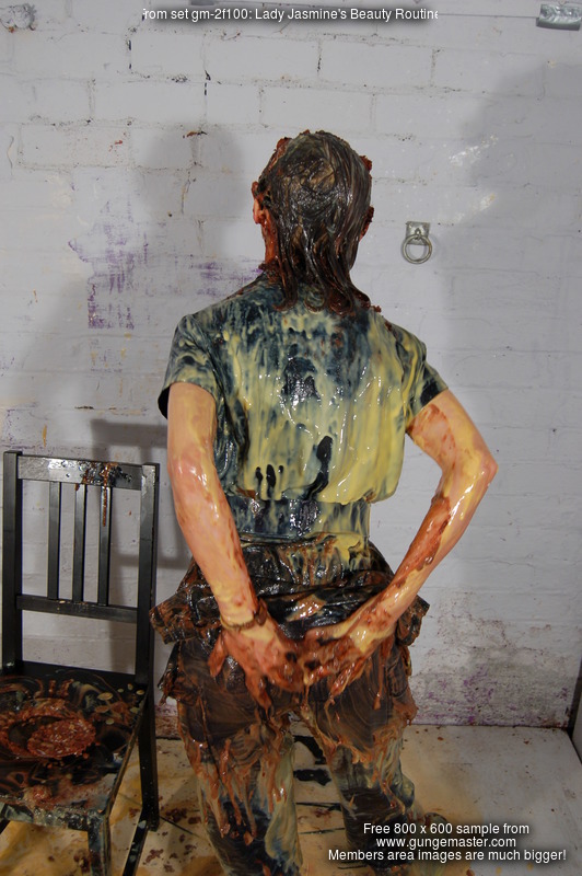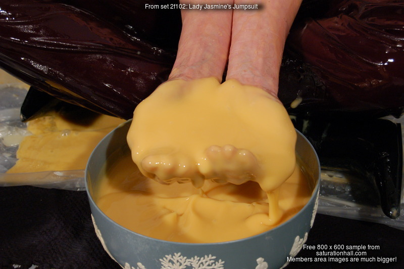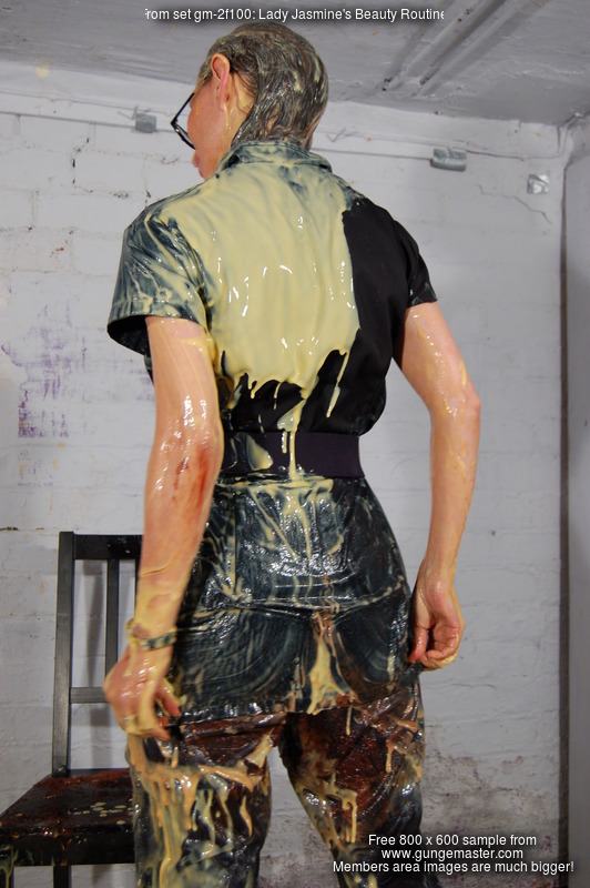 Lady Jasmine starts slowly, first she takes her shoes off, fills them, and slips them back onto her feet. Then a little gunge into each pocket, though she manages to miss with the right hand one and gets a lovely thick streak of yellow all down the front of the costume before emptying a couple of cartons down the inside, from where the thick yellow liquid soon flows out onto her tights and down her shapely legs. While gunge is still dripping from inside, she subjects the suit to an alternative take on her favourite 'sitting in a tray of goo' approach, sitting reverse-astride the chair-back as she lowers her still-clean bottom into the full tray of custard.