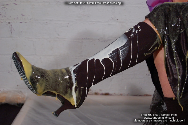 And then, having whet her appitite with the cream dripping down inside her shiny suit, Mistress sets about herself in style! Milk down the catsuit, one boot filled with cream while being worn, the other slipped off, filled with custard, and slipped back on again, custard inside and outside her clothes, sitting in pools of goo, and all the while getting steadilier messier and messier, but keeping perfect composure and strict manners!