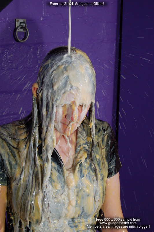 And then it was bucket time, and Chastity receives several well filled buckets of mixed custard and syrup straight over her head and all down her dress. Milk is addded too, and to finish off, once she has been totally and completely gunged, Willomina pours glitter confetti all over her too, which of course sticks to Chastity's completely gunge-drenched long hair and clothes.