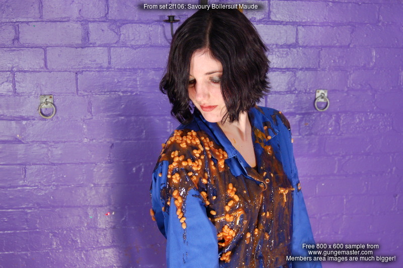 Once befire Maude gave herself a savoury drenching in her smart uniform, now she's decided to repeat the experience, this time in her workwear blue boilersuit and blue wellies.