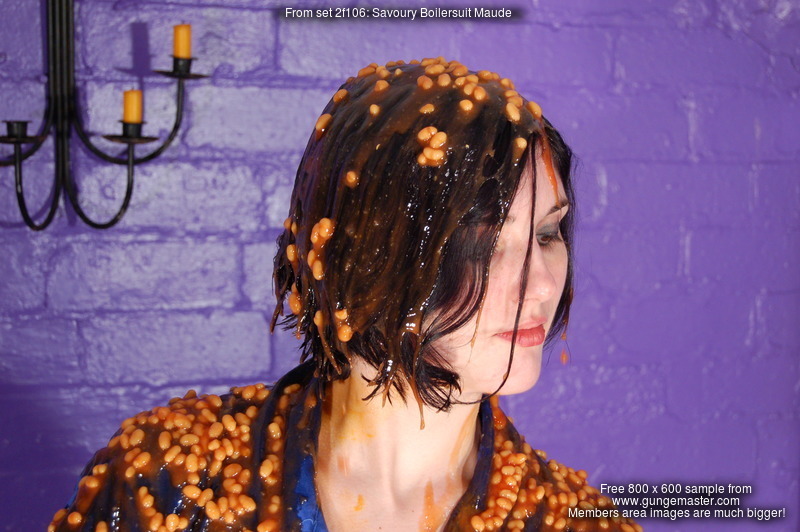 She starts with soup poured into the front of her suit, quickly followed by more down the back - watch her wiggle as it drenches her bottom! Mour soup and then beans are added, and eventually tomato juice too, until her outfit and hair have been reduced to a savoury-drenched mess. In which she plays, rolling on the floor, draggiung her already messy hair through the pool of beans and soup, and scooping up great handfulls of mess to pour over her already-soaked outfit.