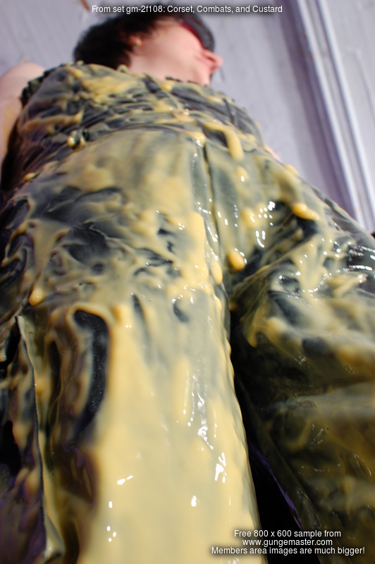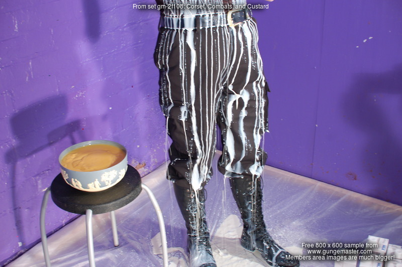 First, she pours four litres of custard onto the floor, making a nice gooey pool, she then slide-steps into the pool, coating the lower hem, and then bends down and ensures the lower few inches of the skirt are thoroughly coated inside and out.