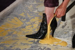 She starts with a carton of milk poured into her suit, which floods down inside and leaks out all over the fabric. Then she pours some honey into a tray, and sits in it, saturating the seat of her suit. Next she takes one of her little boots off, revealing the shiny silver interior, before she fills it with custard and then puts it back on her foot.