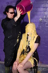 Needless to say we were happy to oblige her! Wearing one of her own short dresses, with fishnet tights and huge Goth boots, she entered the dungeon knowing that Willomina was going to totally give her the treatment, just as she'd requested. She also gets to mix up the first bucket of the gunge she is going to receive, which she rather enjoys doing.