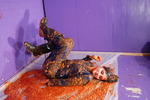 To finish off, Chastity sinks to the gunge-coated floor and plays in the pool of spilled mess.