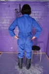Eventually she gets hosed down, still in the boilersuit and boots. Once the worst of the mess has been washed off it, she takes the boilersuit off to reveal the dance leotard she's wearing underneath. She then fills and covers the leotard with yet more soup, front and back, before being hosed down again, in just boots and leotard this time.