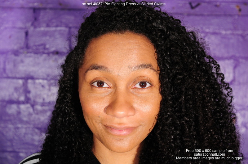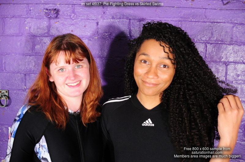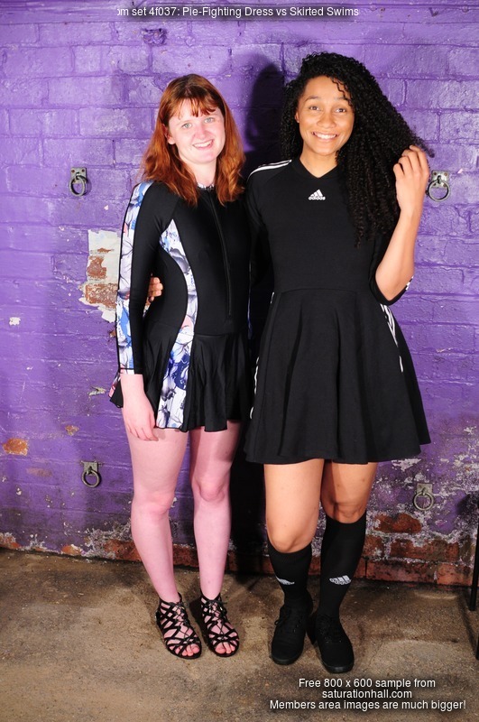 After a long absence, Friday has returned to Saturation Hall in the Autumn of 2022, and finds herself in the dungeon, dressed in am Adidas pie-fighting, black sports socks, and black plimsolls, where she is about to get spectacularly messed up by Miss Abigail who's dressed for messy pleasure in a skirted swimsuit dress and strappy sandals, showing off her toes.
