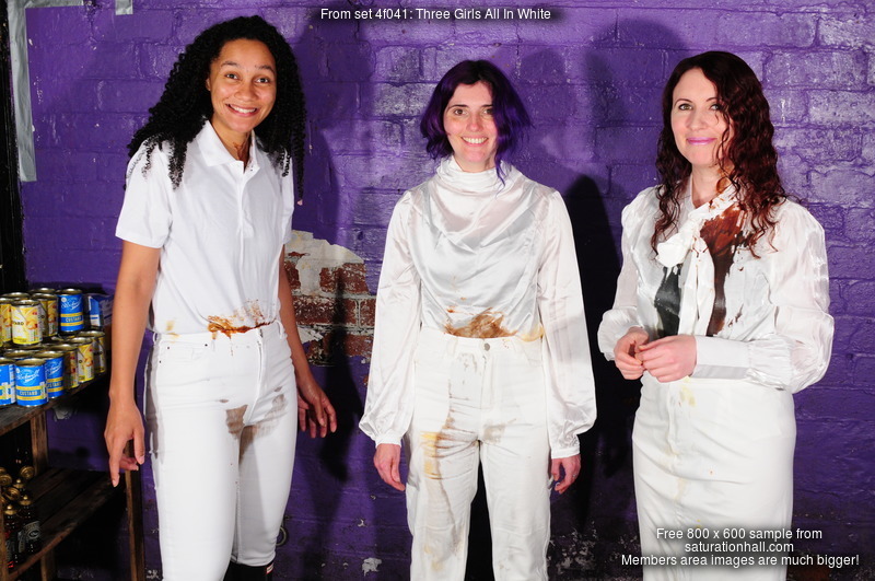Imagine, three of our people, all dressed in gleaminmg white outfits, in the dungeon together, with a delicious supply of sweet mess to hand, but they've been told they all have to stay spotlessly clean for the grand reception in the house later today. And then Friday can't remember if she shut the great hall doors or not so nips back upstairs to check. Do you think the other two might be tempted to prepare a tray with custard and chocolate sauce? And do you think that Friday, on her return, might just happily sit down without checking, and suddenly find the seat of her spotless white trousers engulfed in gloopy creamy mess?