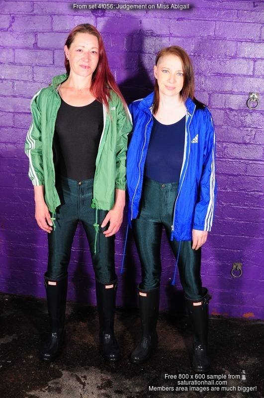 Our judges this time are Lucia and Charity, and they dress nearly identically in green disco pants over dance leotards, with Hunter wellies, and lightweight Adidas zip jackets. Lucia's leotard is black and her jacket green, Charity's leotard is blue and so is her jacket.
