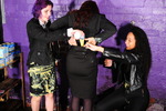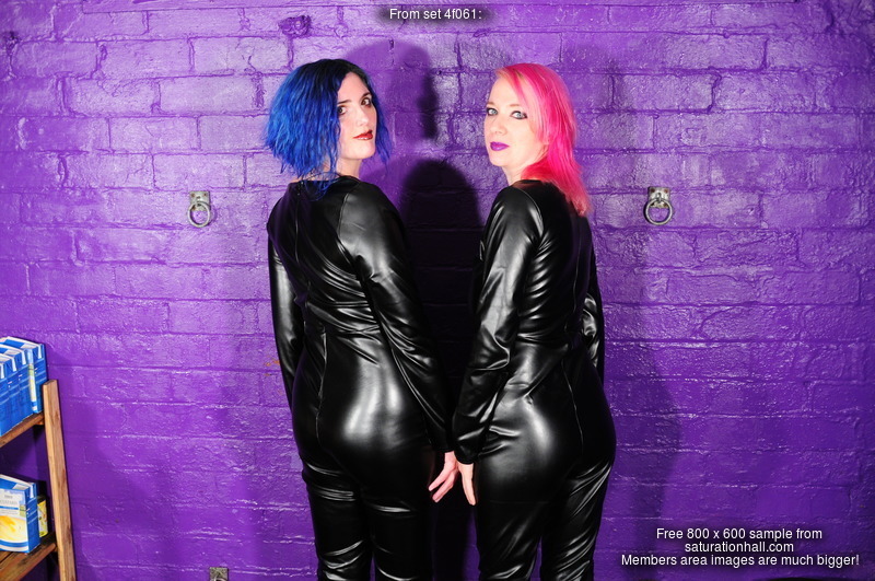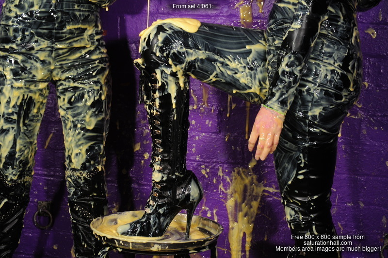 Darkness is gathering over Langstonedale Chase as Autumn runs towards Winter, the outdoor play season is over for another year, and our lovely messy wenches take to the hall's dungeon once more for for their messy fun fix. Which in this case features Maude and Charity, dressed in stunning black vinyl catsuits worn with no underwear, and very nice high boots, utterly drenching each other in lashings of custard!