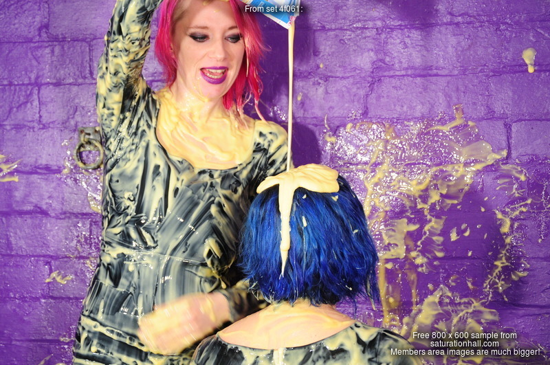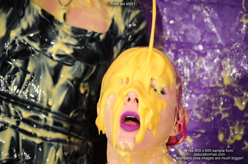 Some filling first of course, and soon they both have lovely yellow gloop slithering and sliding its way down inside their catsuits, wet and slippery against their skin. And then they set about each other on the outside too, and before long both are reduced to happy, custard-soaked ruin.