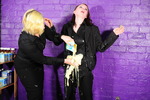 Lucia, wearing black PVC jeans, a shiny black top, black zip-front top over it, and calf-high patent leather boots, over a black bra and panties set.To start with, they all strip down to their underwear. Then, in pairs, taking turns, they play Scissors-Paper-Stone, and the loser of each round has to choose whether she is going to put some clothes on, or have some custard in what she's already wearing.
