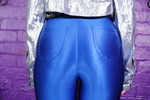 Miss Abigail, wearing blue disco pants, a shimmery silvery top and shimmery shirt, worn open, with very cute colourful ankle boots, over a black bra and panties set.